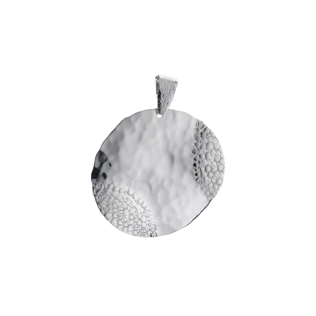 Ciondolo tondo in argento 925 rodiato, tutto realizzato e martellato a mano.